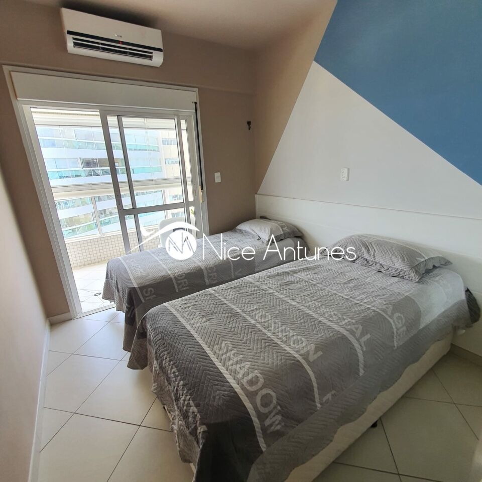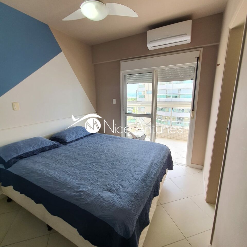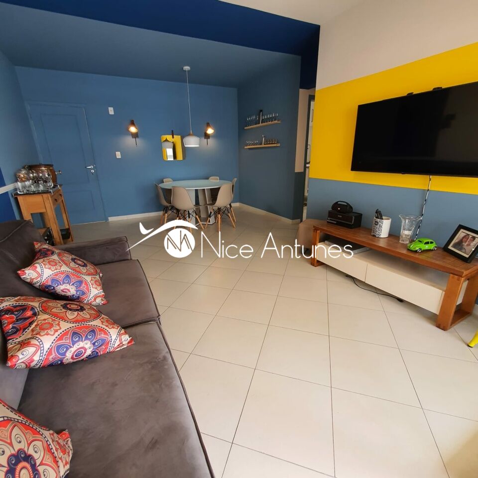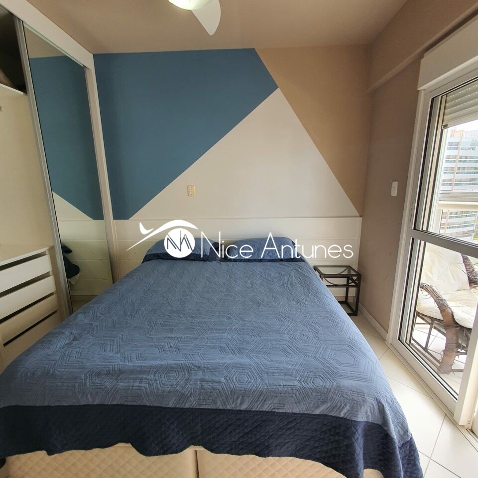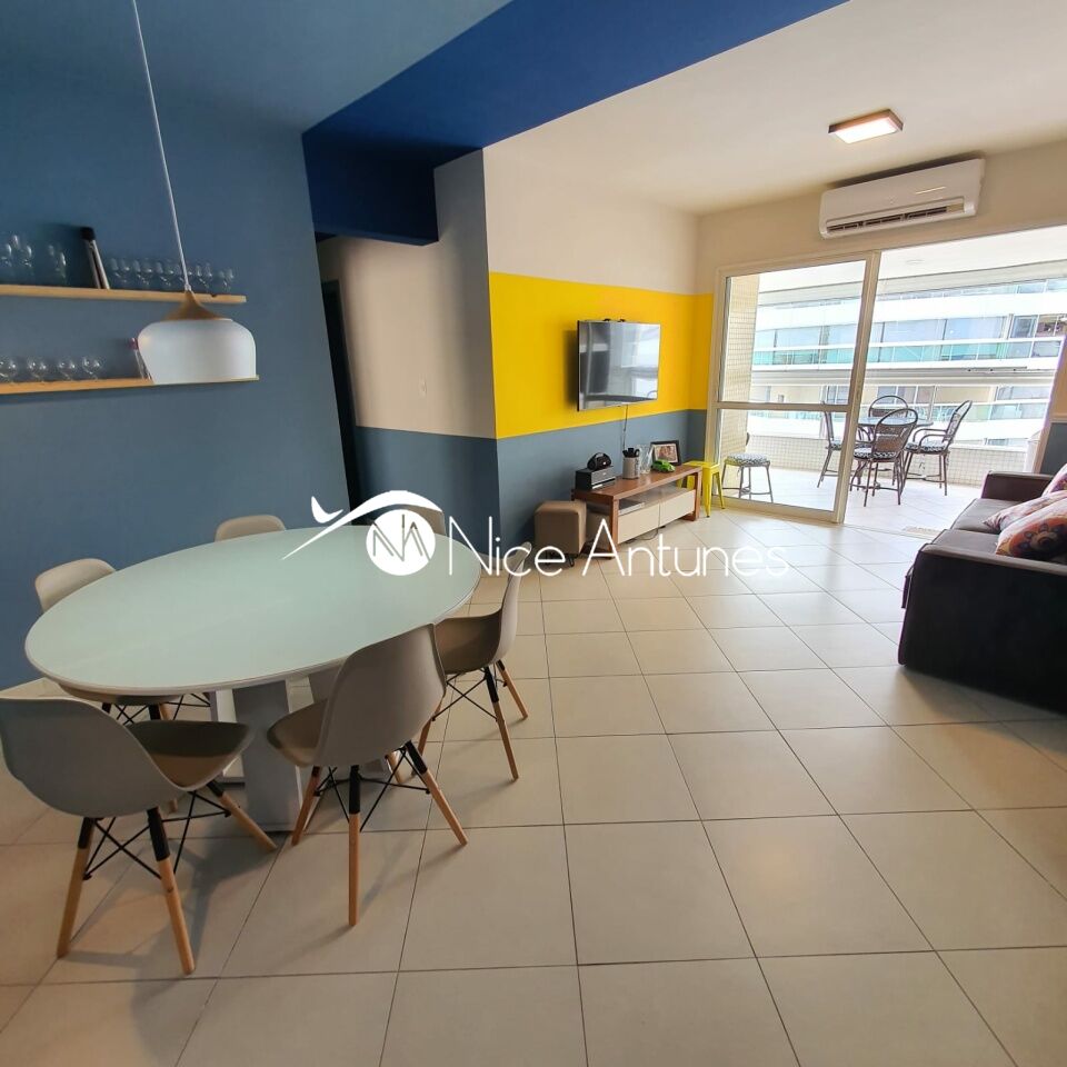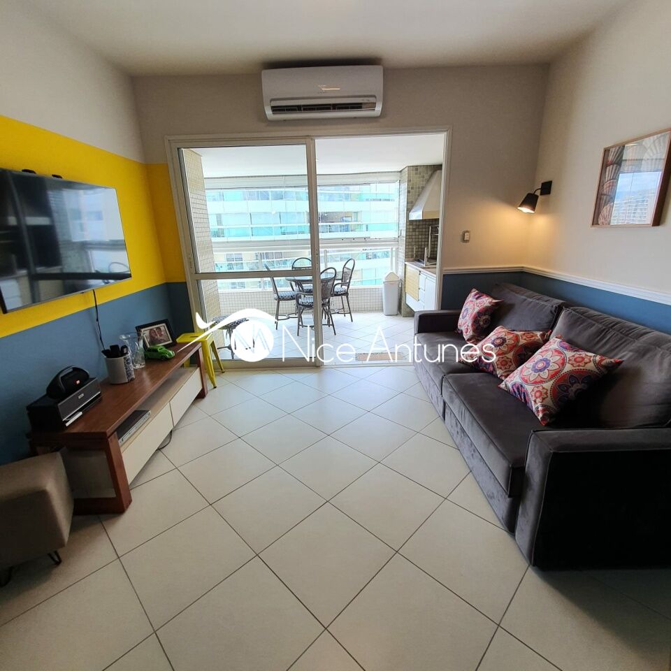O interior é moderno e bem decorado, com uma sala de estar espaçosa, equipada com ar-condicionado, TV e sofá, que se integra à varanda, criando um ambiente aconchegante e iluminado.