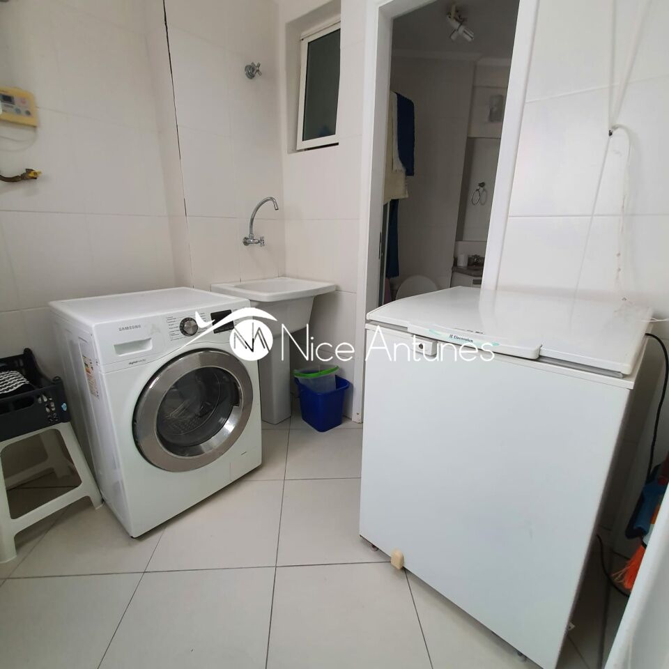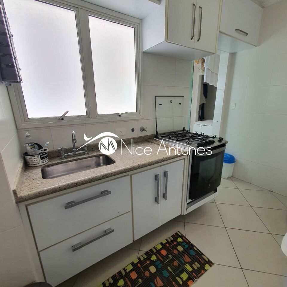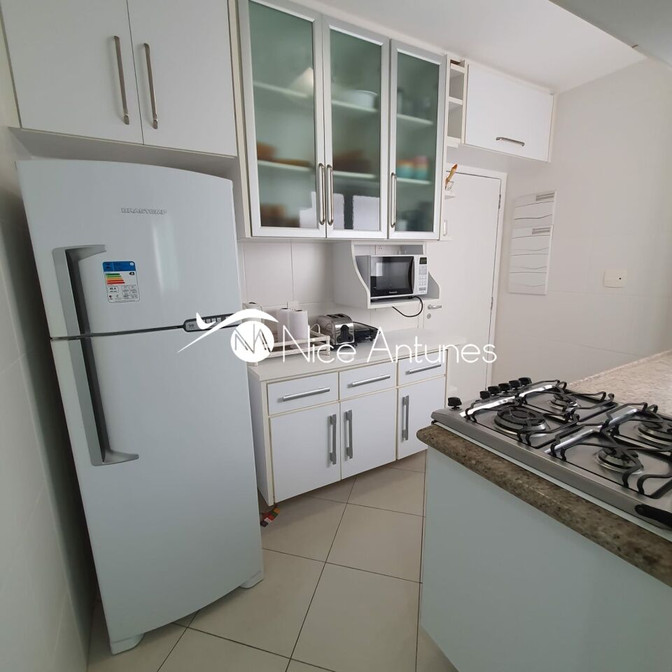 A cozinha é prática e funcional, com armários planejados, geladeira, fogão e micro-ondas, além de uma área de serviço anexa.