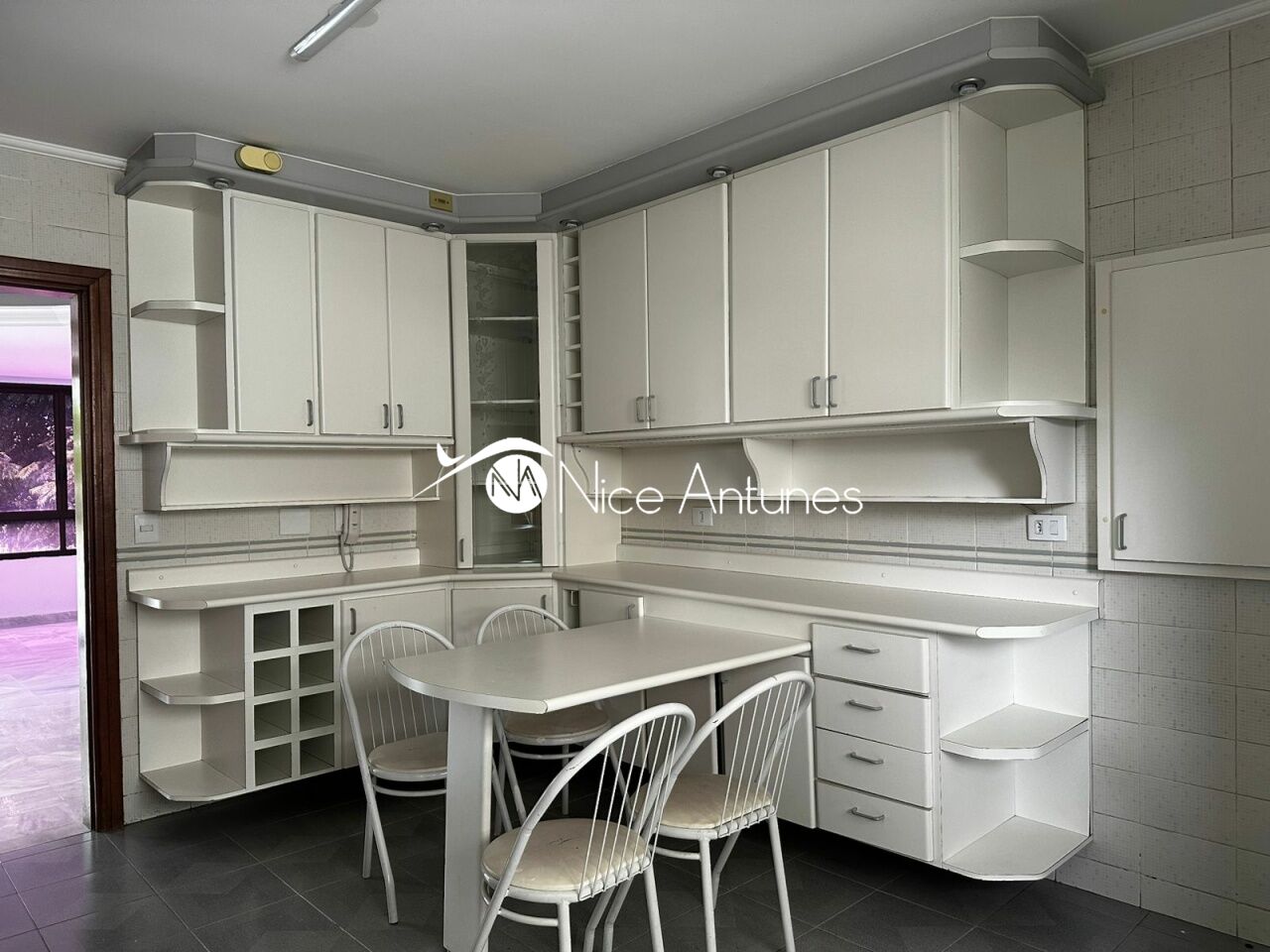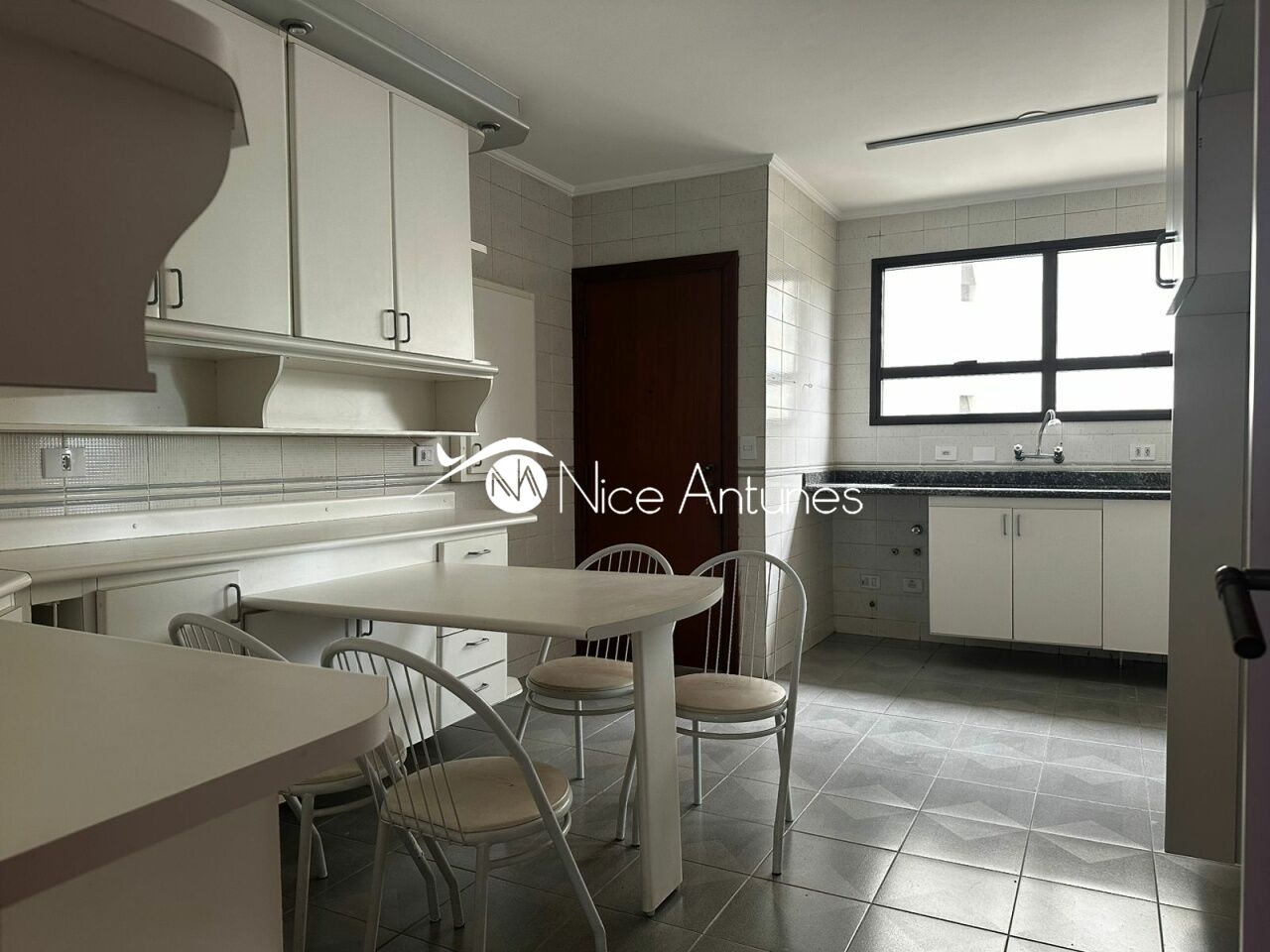 Cozinha e área de serviço muito amplas repleta de armários.